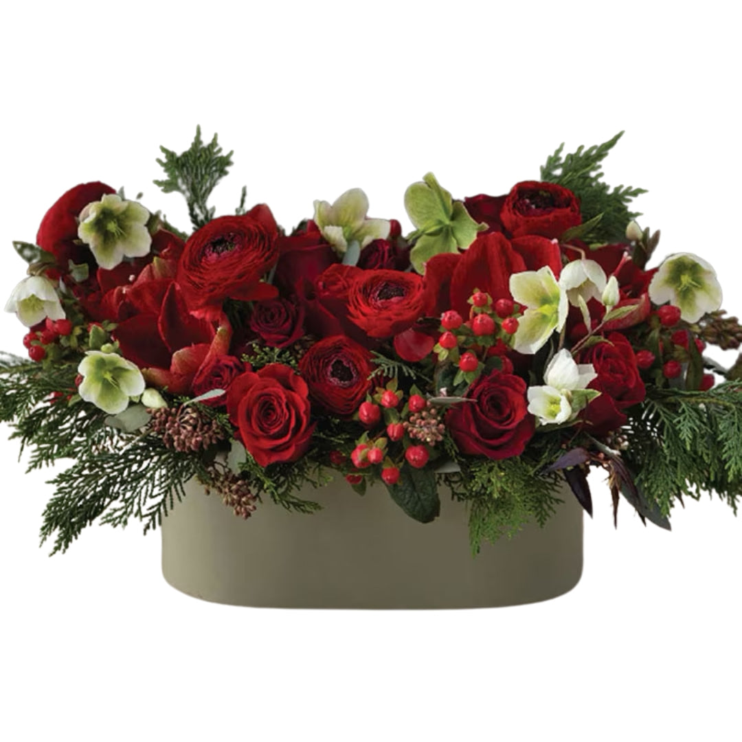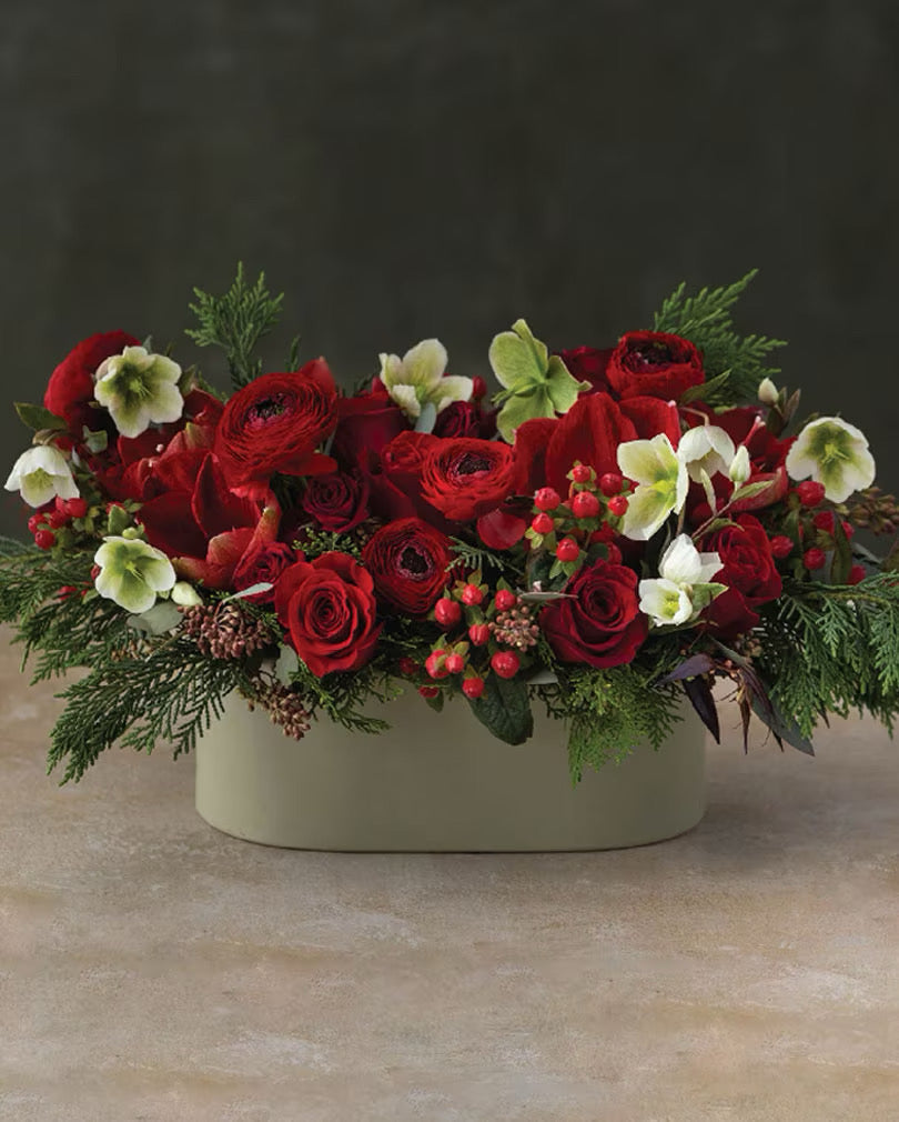 Ruby Christmas centerpiece is luxury, highly scented, modern, loose styled centerpiece. Asymmetric style is prefect for any table, cool and modern present for your loved one. Rich color palette of greens, red roses, ranunculus, pine cones, orchids, are loosely tied with textural swing and foliage. This arrangement is real show-stopper.