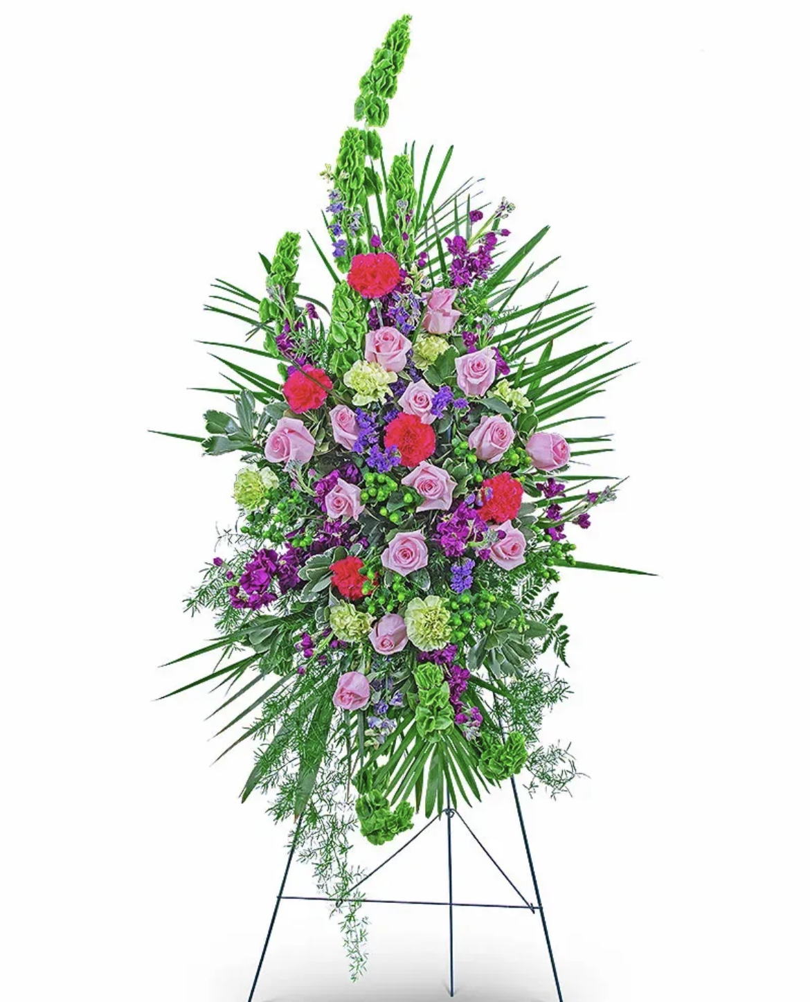 Always in our hearts standing spray bright & classical that allows you to show love and respect to your loved one. Our standing spay features of pink roses roses, hot pink Dianthuses, Matiolla, hydrangeas, snapdragons and premium greens.