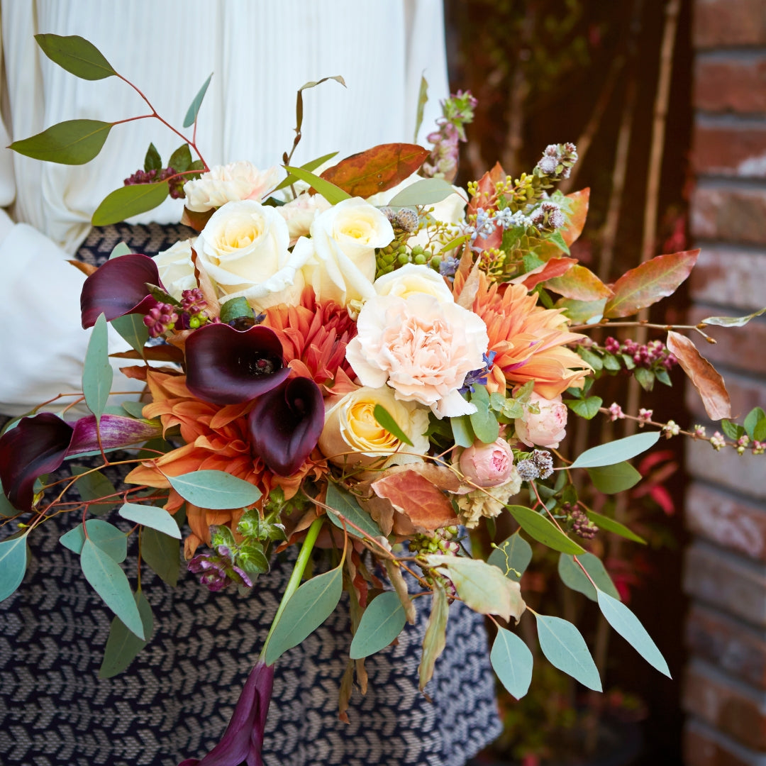 An absolutely unique mix of roses, Cala lilies, carnatians,moms and eucalyptus beautifully presented in a European manner.