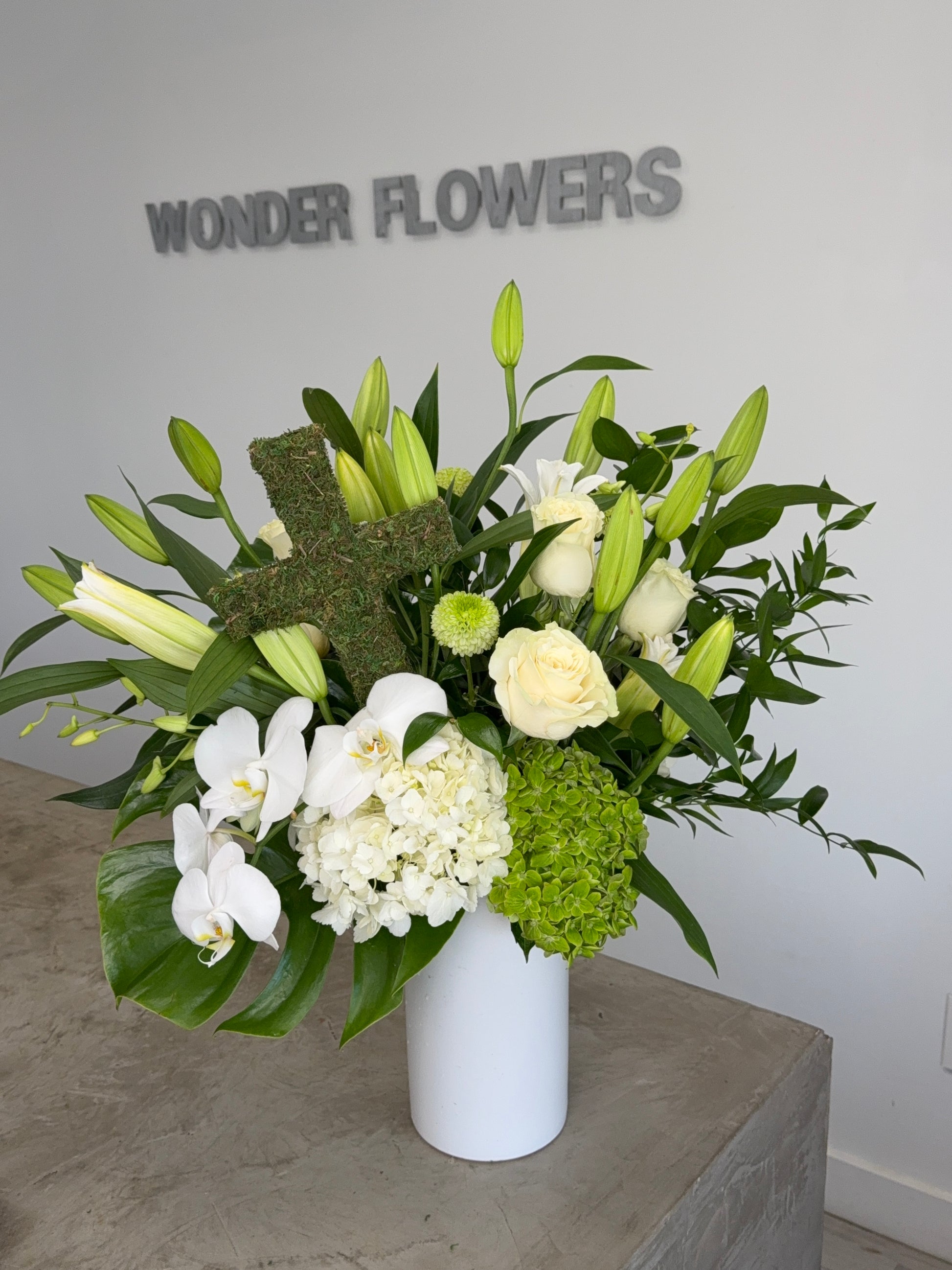 Each arrangement is handcrafted in Delray Beach by Wonder Flowers, using only the freshest seasonal blooms to ensure quality and longevity. Whether you’re sending a message of love, comfort, or celebration, this all-white floral design adds a beautiful, peaceful presence.