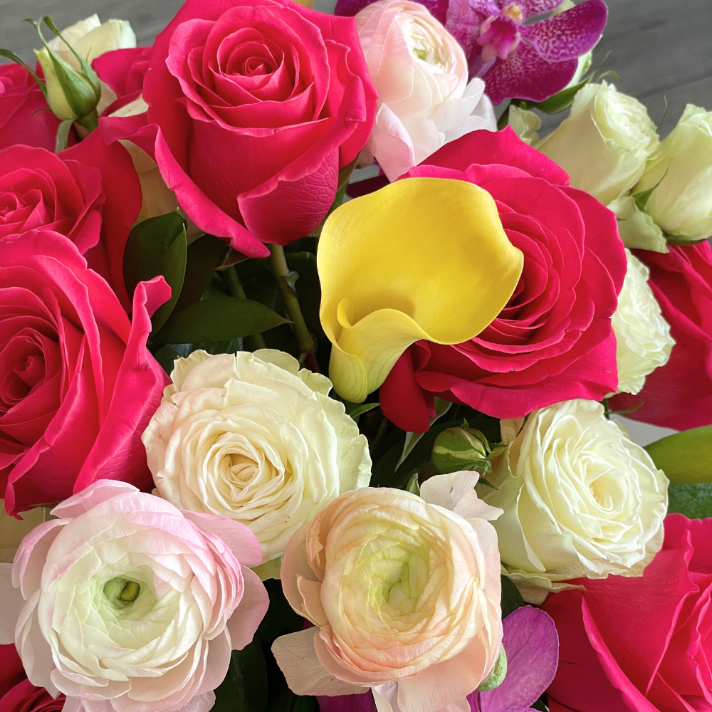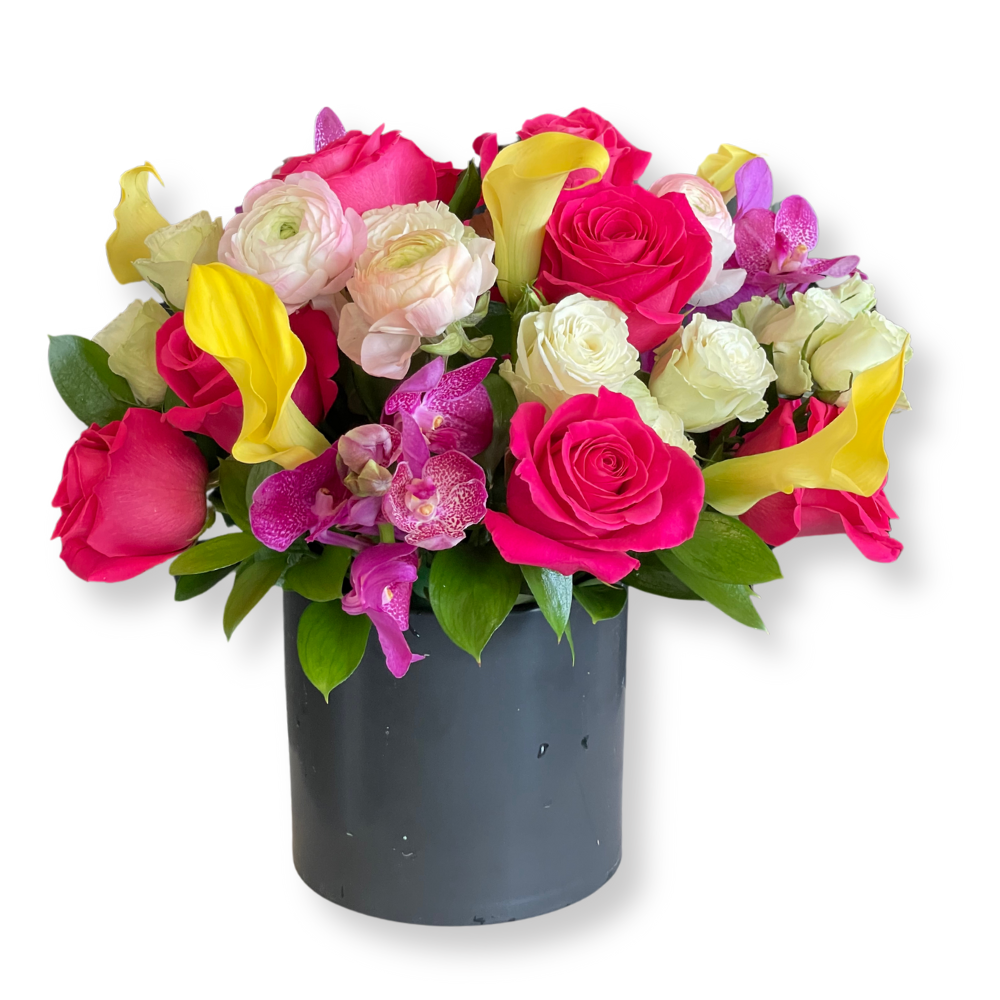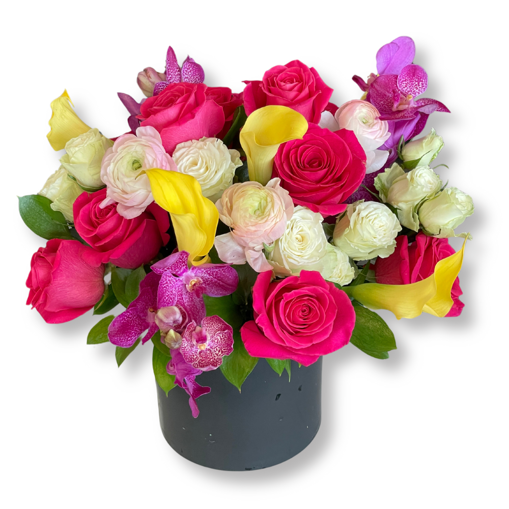 Bursting with vibrant energy, Tropical Radiance brings together the bold beauty of hot pink roses, sunny yellow Calla lilies, and exotic orchids. This striking arrangement is a celebration of color and life, perfect for brightening any occasion. Presented in a modern vase, each bloom is meticulously placed to create a lively and joyful masterpiece. Whether it's a birthday, special event, or simply to uplift someone’s day, this eye-catching arrangement is sure to make a statement with its radiant mix of tropical charm and elegance.